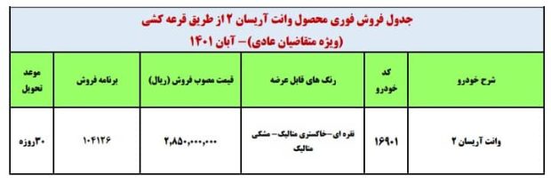 گروه صنعتی ایران خودرو قصد دارد وانت آریسان ۲ را در قالب طرح فروش فوری با قرعه کشی از روز یکشنبه ۲۲ آبان ۱۴۰۱ به مدت ۲ روز به بازار عرضه کند. در این بخشنامه فروش تمامی محدودیتهای قرعه کشی همانند گذشته اعمال میشود. در ادامه جزئیات قیمت وانت آریسان ۲ به همراه شرایط فروش آن در آبان ۱۴۰۱ را مشاهده میکنید: