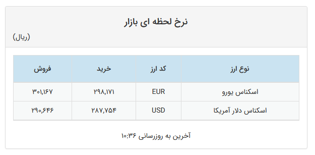 علاوه بر این، نرخ خرید اسکناس دلار در بازار متشکل ارزی ۲۸ هزار و ۶۷۹ تومان و نرخ فروش آن ۲۸ هزار و ۹۳۹ تومان اعلام شد.