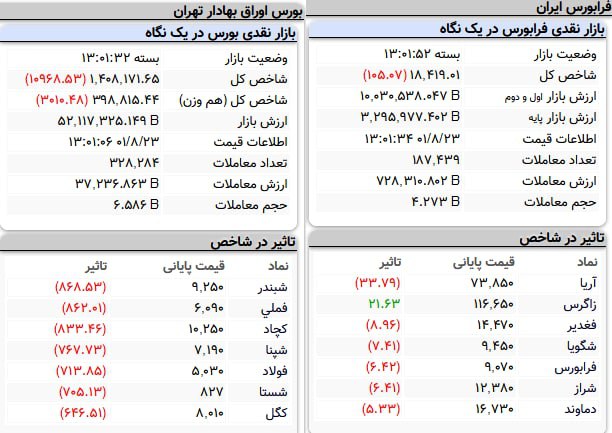 پلیمر آریاساسول، آهن و فولاد غدیر ایرانیان، پتروشیمی تندگویان، فرابورس ایران، پالایش نفت شیراز و تولید نیروی برق دماوند نسبت به سایر نمادها بیشترین تاثیر منفی را روی فرابورس گذاشتند و در مقابل پتروشیمی زاگرس نسبت به سایر نمادها بیشترسین تاثیر مثبت را روی فرابورس گذاشت.