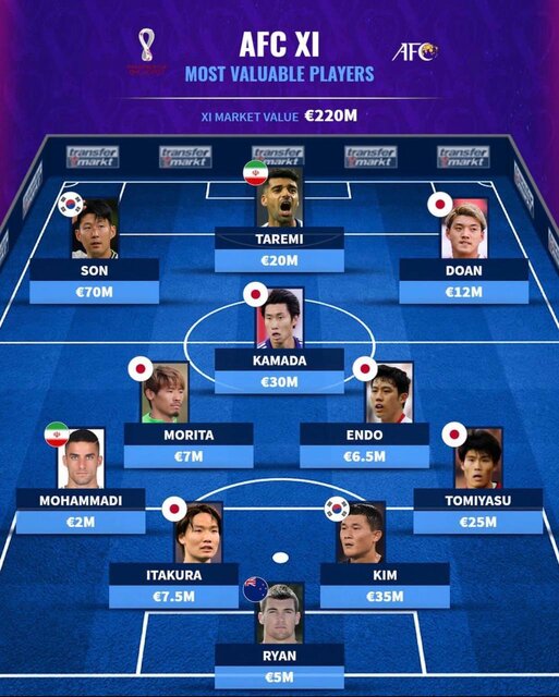 به گزارش سایت طلا ، سایت ترانسفر مارکت به معرفی ترکیب با ارزشترین بازیکنان پنج قاره پرداخت و در ترکیب آسیایی نام دو ایرانی دیده میشود. مهدی طارمی با ارزش ۲۰ میلیون یورو در نوک خط حمله و میلاد محمدی با ارزش ۲ میلیون یورو در سمت چپ خط دفاعی ترکیب با ارزشترین بازیکنان آسیایی جام جهانی قرار گرفتند. در این ترکیب ۶ بازیکن ژاپنی، ۲ بازیکن کرهای و یک بازیکن استرالیایی نیز حضور دارند.
