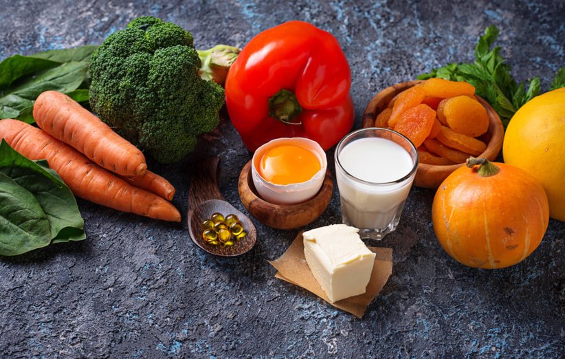 منابع غذایی ویتامین A شامل ویتامین‌های محلول در چربی است و در منابع حیوانی یافت می‌شود که از این بین می‌توان به جگر، روغن کبد ماهی، شیر و لبنیات، زرده تخم مرغ و کره پاستوریزه اشاره کرد. اما پیش‌ساز این ویتامین یا همان بتا کاروتن در منابع گیاهی نظیر هویج، هندوانه، گوجه فرنگی و سبزیجات برگ سبز، فلفل‌های دلمه‌ای، انبه، موز، آلو، زردآلو، هلو وسایر میوه‌ها وسبزی‌هایی که به رنگ زرد، نارنجی، قرمز و سبز تیره هستند نیز وجود دارد.