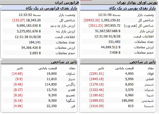 شاخص بازار اول بورس 1.8 درصد افت کرد و شاخص بازار دوم بورس 94 صدم درصد کاهش یافت.