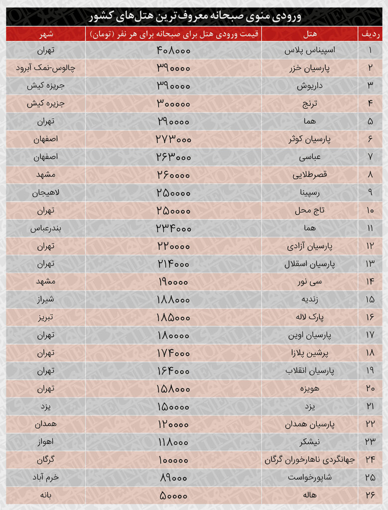 در جدول زیر مبلغ ورودی منوی صبحانه معروف ترین هتل های کشور را می بینید.