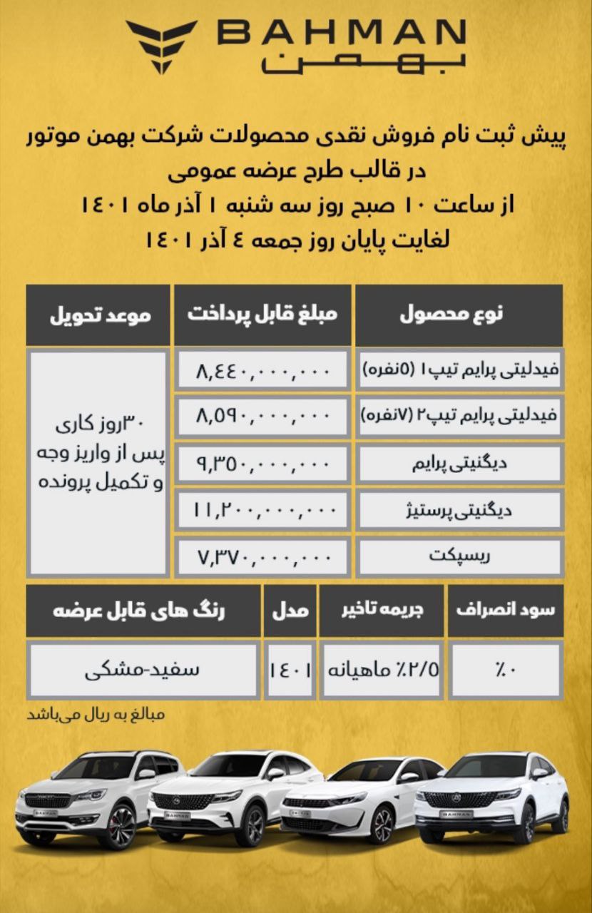 فروش فوری محصولات بهمن موتور از 1 آذر 1401 آغاز می شود + قیمت