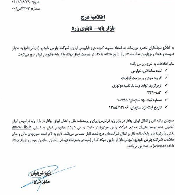 به گزارش سایت طلا، براساس اطلاعیه شرکت بورس تهران از تاریخ 1401.07.19 شرکت پارس خودرو از فهرست شرکتهای پذیرفته شده در بورس تهران حذف و قابل انتقال به بازار پایه فرابورس شده بود که روز گذشته مجوز حضور این نماد در تابلو زرد فرابورس صادر شد.
