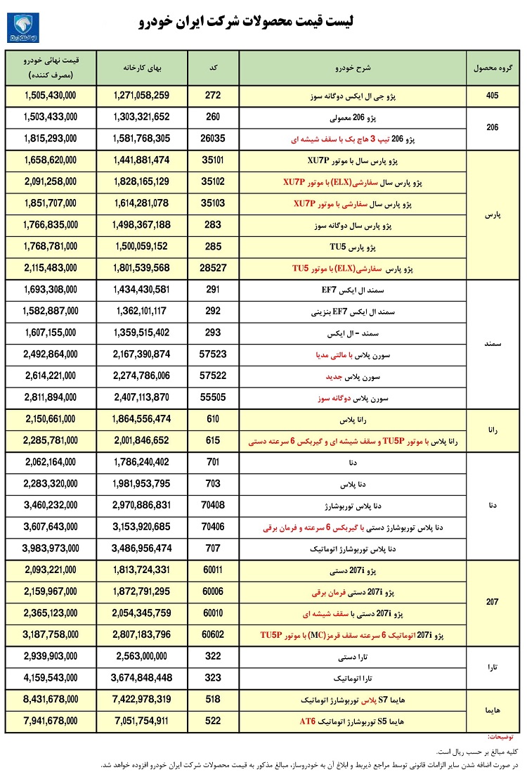 لیست قیمت کارخانه ای محصولات ایران خودرو در آذر 1401 اعلام شد.
