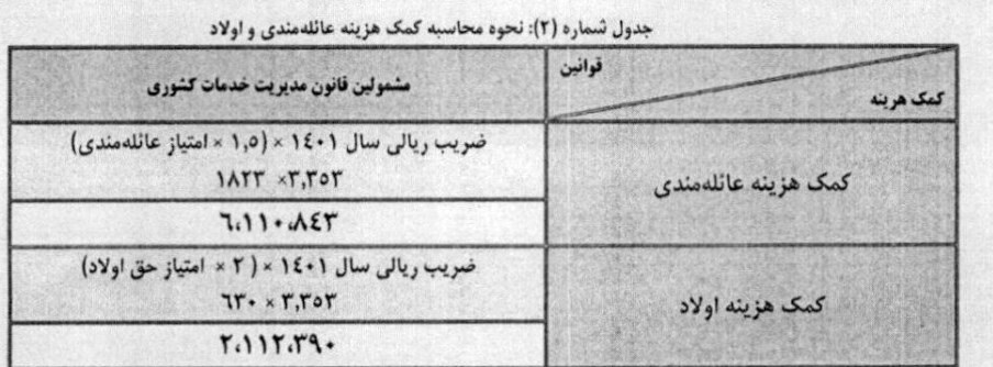 کمک هزینه اولاد و عائلهمندی بازنشستگان، وظیفه بگیران و مشترکان صندوقهای بازنشستگی کشوری و لشکری و سایر صندوقهای بازنشستگی وابسته به دستگاههایی اجرایی مشمول قانون مدیریت خدمات کشوری همانند مراتب مندرج در جدول شماره ۲ افزایش می یابد.