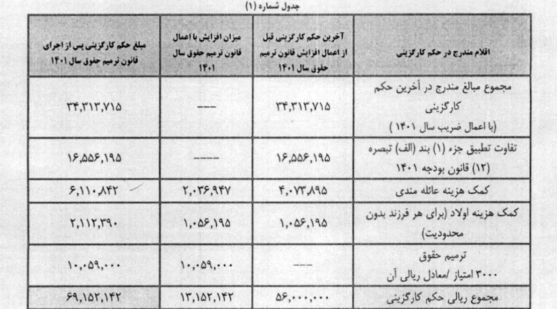 معادل ریالی امتیاز مذکور به میزان (۱۰۰۵۹۰۰۰) ریال در احکام کارگزینی و قراردادهای کارکنان مشمول قانون نظام هماهنگ پرداخت کارکنان دولت با عنوان ترمیم حقوق د ر یک ردیف مستقل درج میشود.