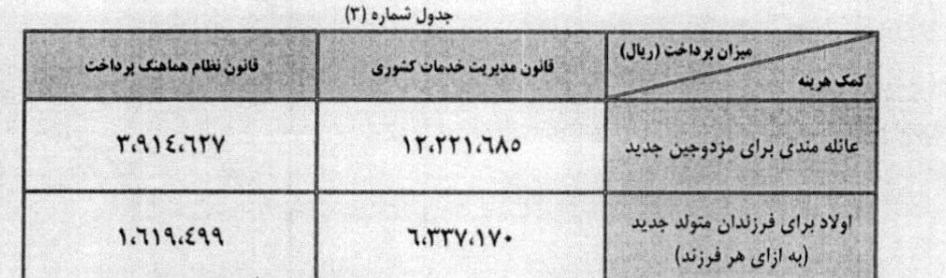 در اجرای قانون حمایت از خانواده و جوانی جمعیت، کمک هزینه اولاد و عائلهمندی تمامی گروههای مختلف حقوق بگیر اعم از شاغل و بازنشسته و همچنین نیروهای مسلح، وزارت اطلاعات، سازمان انرژی اتمی از قبیل کارکنان کشوری و لشکری، اعضای هیئت علمی دانشگاهها و قضات به ترتیب به میزان ۱۰۰ درصد و ۵۰ درصد به شرح جدول دو افزایش مییابد.
