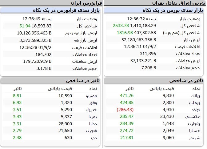 شاخص کل بورس تهران در پایان معاملات امروز با ۲ هزار و ۵۳۳ واحد افزایش در ارتفاع یک میلیون و ۴۱۰ هزار واحدی ایستاد.