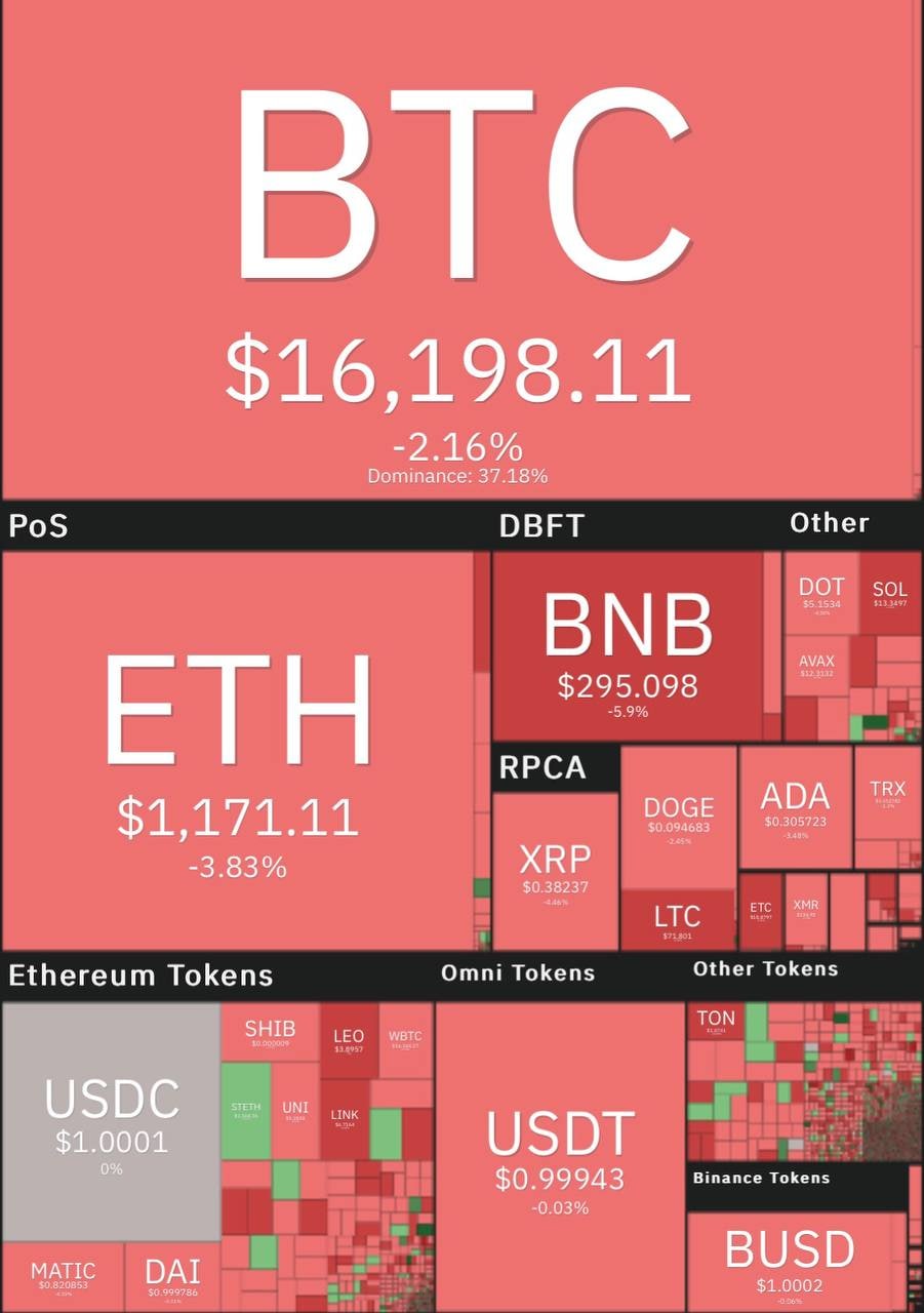 بیتکوین با افت ۲ درصدی به قیمت ۱۶ هزار و ۱۹۸ دلار و اتریوم با ریزش حدود ۴ درصد به قیمت هزار و ۱۷۱ دلار معامله میشوند.