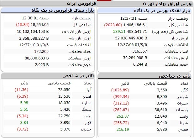 در این بازار هم امروز بیشترین اثر منفی بر شاخص فرابورس به نام نمادهای معاملاتی پلیمر آریا ساسول، آهن و فولاد غدیر ایرانیان و بیمه پاسارگاد، و بیشترین اثر مثبت بر این نماگر به نام شرکتهای تولید نیروی برق دماوند، گروه سرمایه‌گذاری میراث فرهنگی و بیمه کوثر شد.