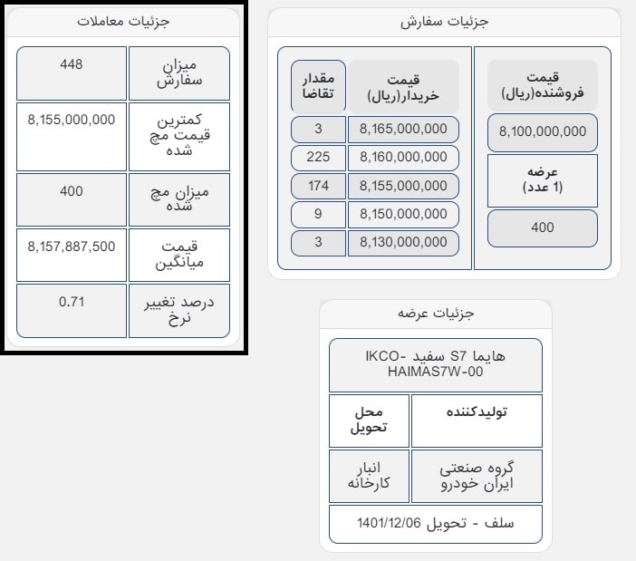 تعداد 400 دستگاه خودرو هایما اس7 سفید شرکت ایران خودرو با قیمت پایه 815 میلیون و قیمت تمام شده حدود 920 میلیون تومان در بورس کالا معامله شد.