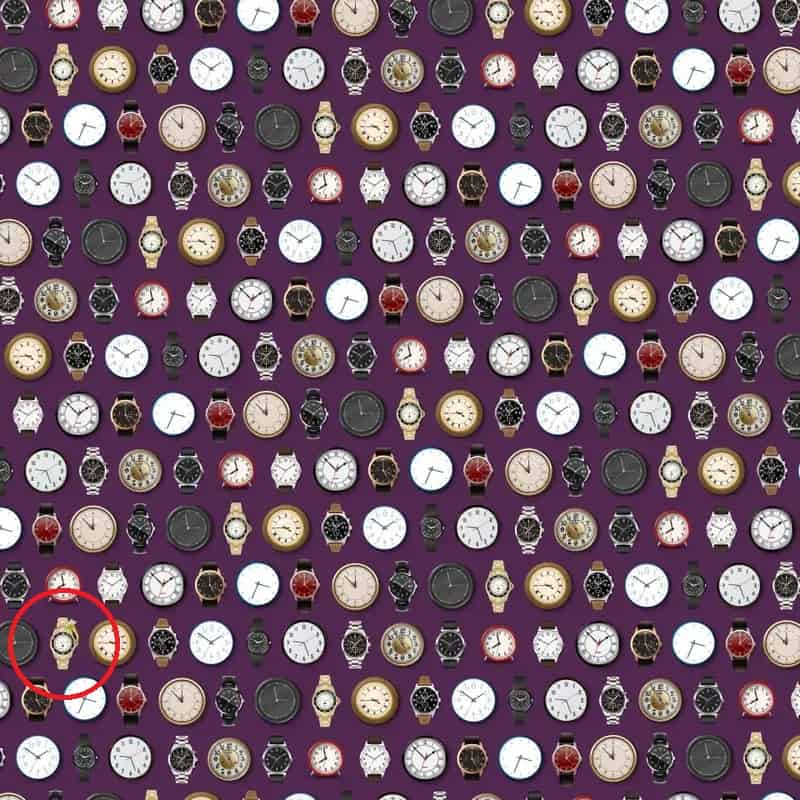 تست هوش تصویری ذهن شما را به چالش میکشد و شما می توانید با انجام این چالش تصویری، مهارت های بینایی خودتان را آزمایش کنید.در این تصویریک حلقه مخفی در بین ساعت ها پنهان شده است. اگر بتوانید حلقه را در عرض ۱۱ ثانیه یا کمتر از آن پیدا کنید جزو نابغه ها هستید. فراموش نکنید که فقط ۱۱ ثانیه زمان دارید.