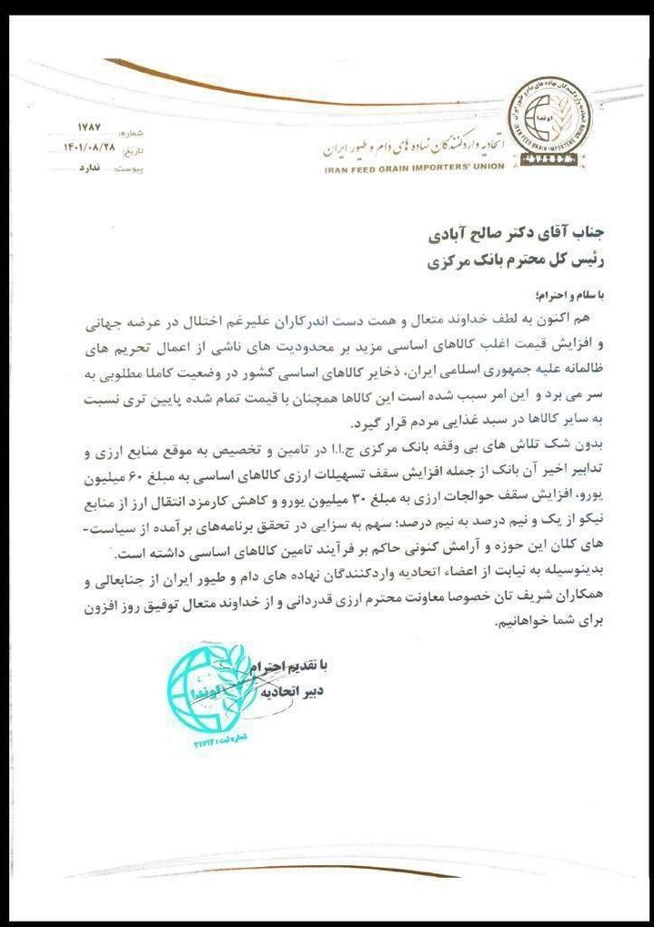همچنین در بخشی از این نامه آمده است:ذخایر کالاهای اساسی کشور در وضعیت کاملا مطلوبی به سر میبرد و این امر سبب شده است این کالاها همچنان با قیمت تمام شده پایین تری نسبت به سایر کالاها در سبد غذایی مردم قرار گیرد.