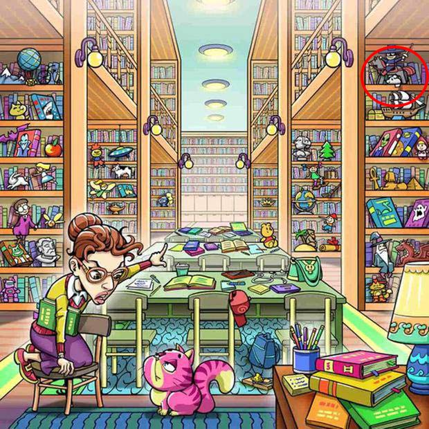اگر موش را پیدا نکردید، ما به شما کمک میکنیم! به قفسه سمت راست بالای کتابخانه در تصویر نگاه کنید. همانطور که در تصویر زیر مشخص است، موش بین یک اسباب بازی و کتاب پنهان شده است.