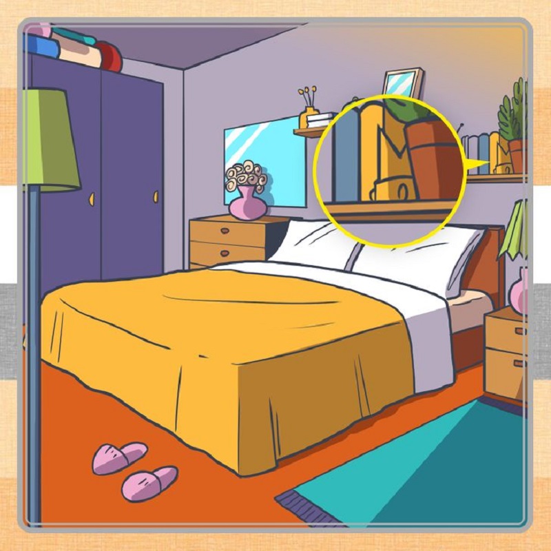 اکثر مردم پس از دیدن این تصویر گیج می شوند. اگر نتوانستید آنها را پیدا کنید، نگران نباشید، تاج روی قفسه درست بالای تخت بین کتاب ها و گیاه پنهان شده است. تشخیص تاجی که با رنگ کتاب استتار شده است دشوار است.
