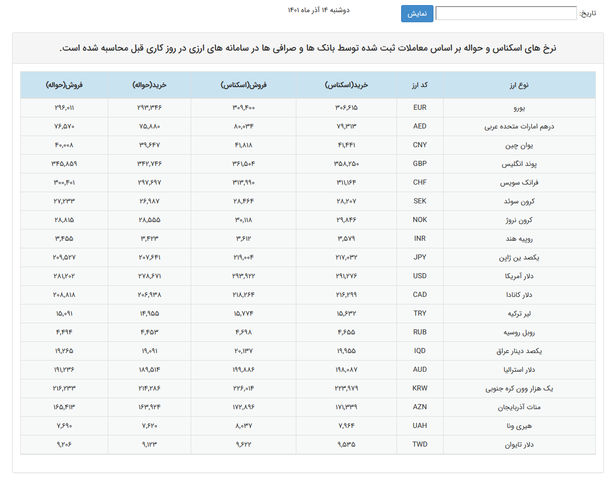 بانک مرکزی امروز، دوشنبه (۱۴ آذر)، نرخ رسمی ۴۶ ارز را اعلام کرد که بر اساس آن نرخ ۲۰ ارز افزایش و نرخ ۱۳ ارز کاهش یافت، نرخ باقی ارزها ثابت ماند.