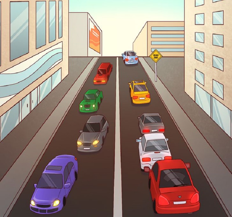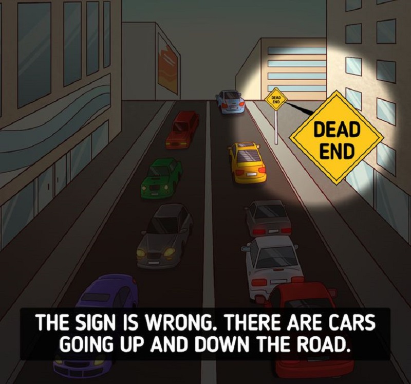 احتمالاً فوراً متوجه اشتباه تصویر نمی شوید . علامت بن بست نزدیک جاده اشتباه است و بن بستی وجود ندارد، زیرا ماشین ها در جاده به سمت بالا و پایین می روند.