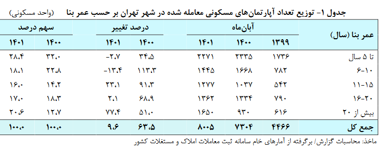 بر اساس گزارش بانک مرکزی یک هزار و ۲۷۷ خانه با عمر ۱۱ تا ۱۵ سال در آبان ماه امسال معامله شدند که در مقایسه با سال گذشته ۲۳.۱ درصد شد داشته است. همچنین معامله خانههایی با ۲۰ سال ساخت در آبان ماه امسال رشد چشمگیری داشته است و از ۹۳۰ عدد معامله به یک هزار و ۶۵۰ مورد رسیده است یعنی ۷۷.۴ درصد رشد که رقم قابل توجهی است.