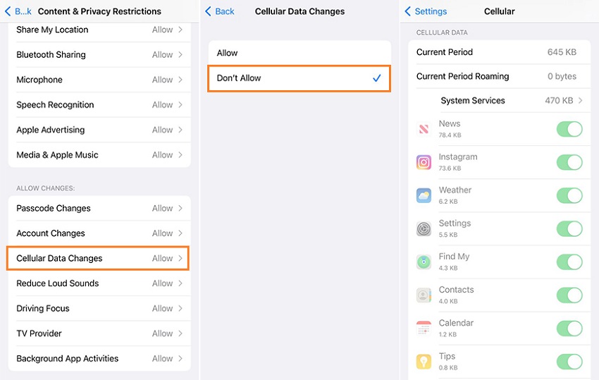 روی Cellular Data Changes ضربه بزنید و Don’t Allow را انتخاب کنید سپس در برنامه تنظیمات به Cellular Data برگردید. اکنون خواهید دید که استفاده از دیتا برای همه برنامهها غیرفعال و محدود شده است.