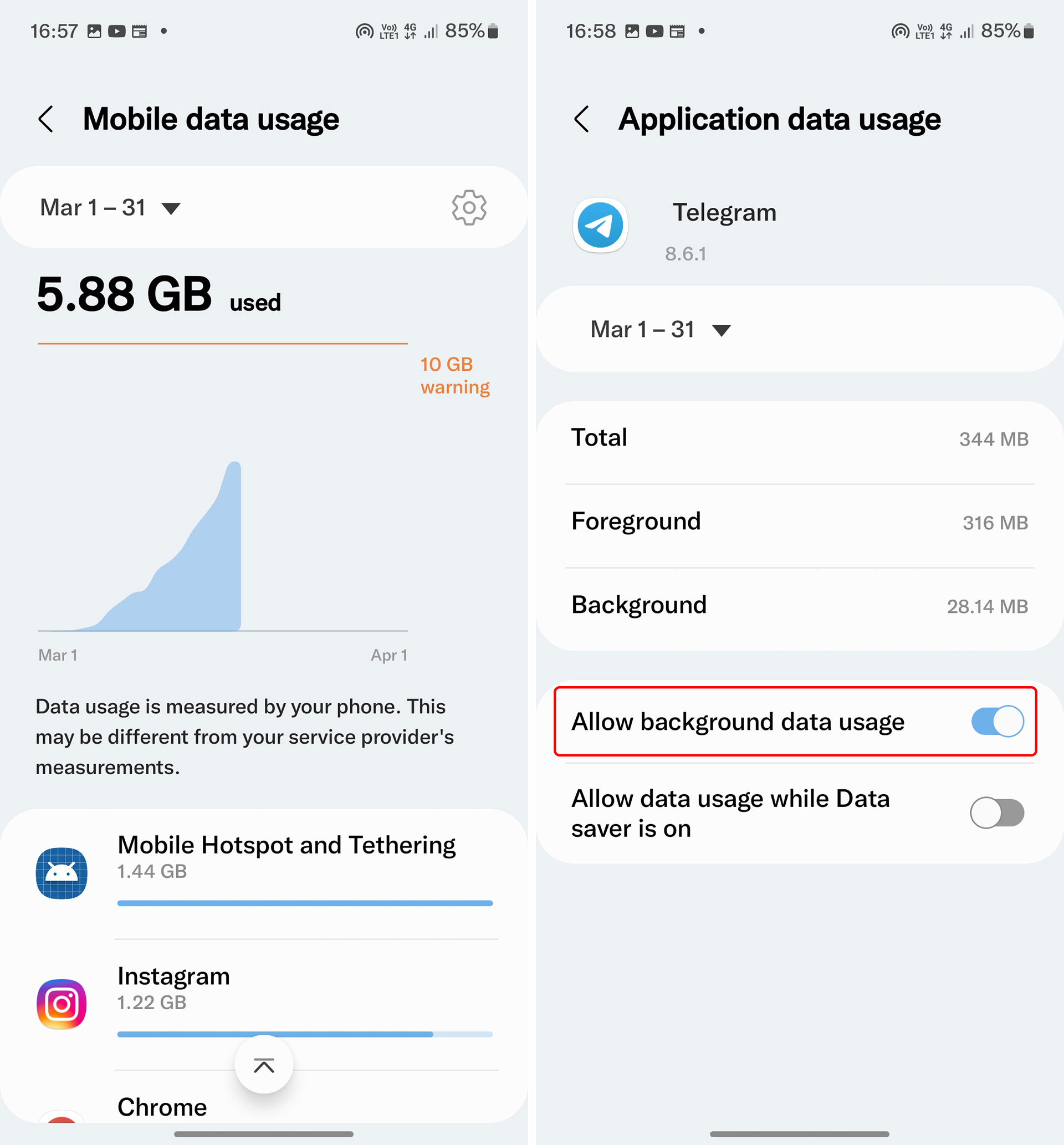 اگر مشاهده کردید حجم زیادی در پسزمینه استفاده شده یا برنامههایی که اصلاً از آنها استفاده نمیکنید مقدار مشکوک و قابل توجهی از حجم اینترنت را استفاده کردهاند، با خاموش کردن گزینهی Allow Background Data Usage (اجازه به مصرف اینترنت همراه در پسزمینه) دسترسی آنها به اینترنت را قطع کنید. توجه داشته باشید اگر این برنامهها را باز کنید همچنان میتوانند از اینترنت موبایل استفاده کنند اما بعد از خروج دیگر به اینترنت دسترسی نخواهند داشت.
