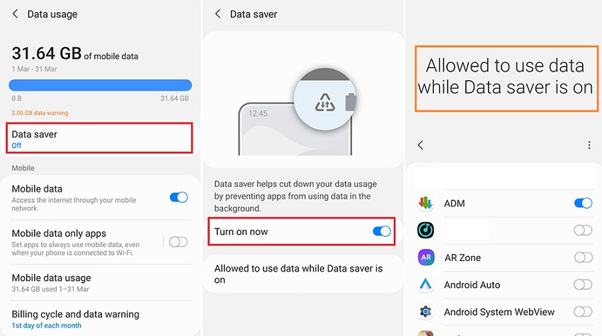 در روش دوم میتوان با انتخاب یک گزینه تمامی اپلیکیشنها را از استفاده از اینترنت در پسزمینه منع کرده و تنها برای چند مورد مانند پیامرسانها استثناء قائل شوید. برای این کار از تنظیمات گوشی وارد بخش Connections (اتصالات) شوید، گزینه Data Usage (استفاده از داده) را انتخاب کنید و سپس روی Data saver (ذخیرهکننده اینترنت همراه) ضربه بزنید. در انتها گزینه Turn on now (اکنون روشن شود) را فعال کنید تا با فعال شدن ذخیرهکننده اینترنت همراه از دسترسی برنامهها به دیتا در پسزمینه جلوگیری شود.