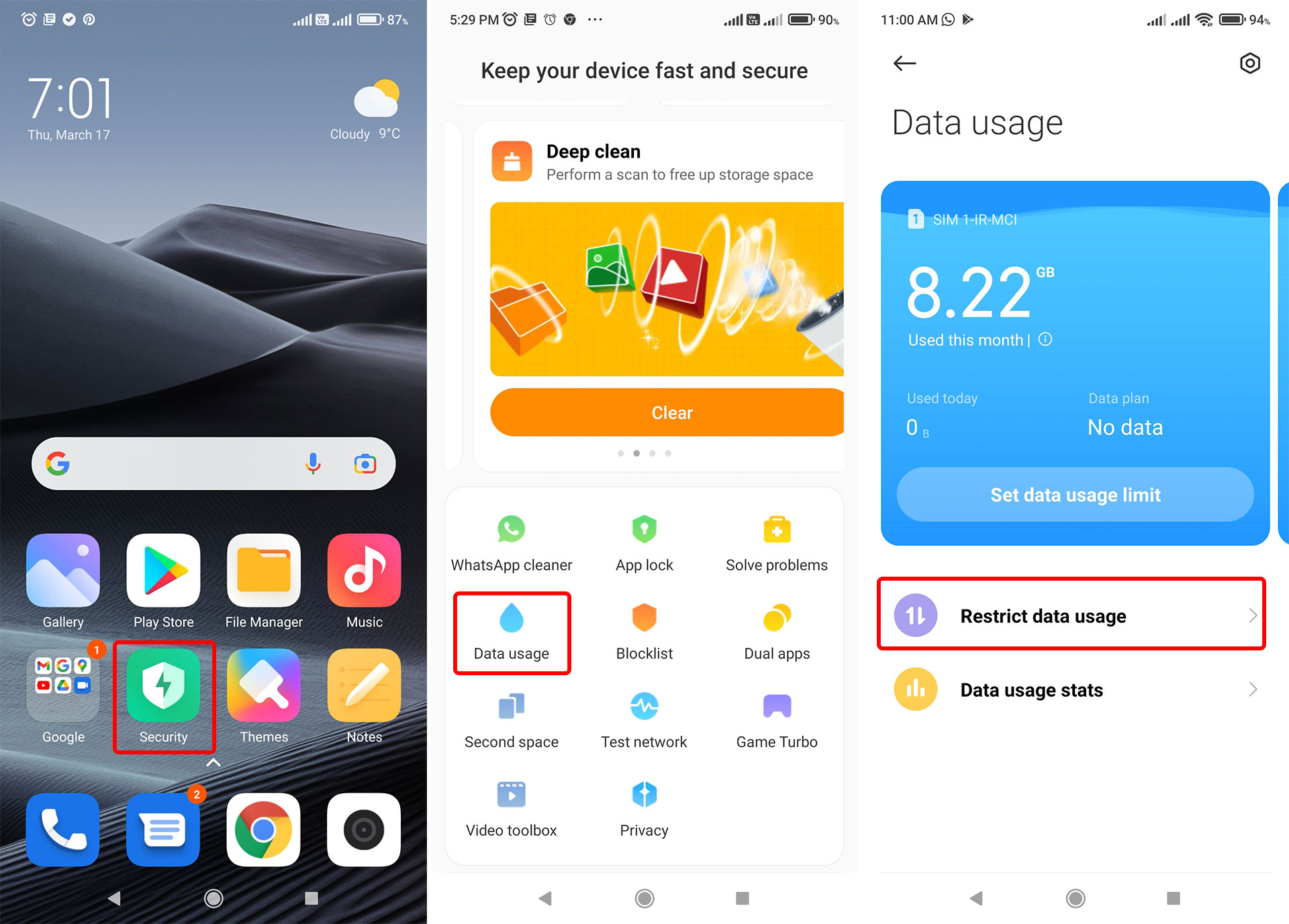 درگوشیهای شیائومی، قابلیتهای بیشتری برای محدود کردن اپلیکیشنها وجود دارد. اول از همه اینکه میتوانید استفاده از اینترنت موبایل را برای هر اپلیکیشنی در دو حالت باز و بسته محدود کنید و دوم اینکه این کار را میتوانید برای زمانی که به وایفای متصل میشوید نیز انجام دهید. اما روش آن در گوشیهای شیائومی اندکی با سایر گوشیهای اندرویدی متفاوت است.