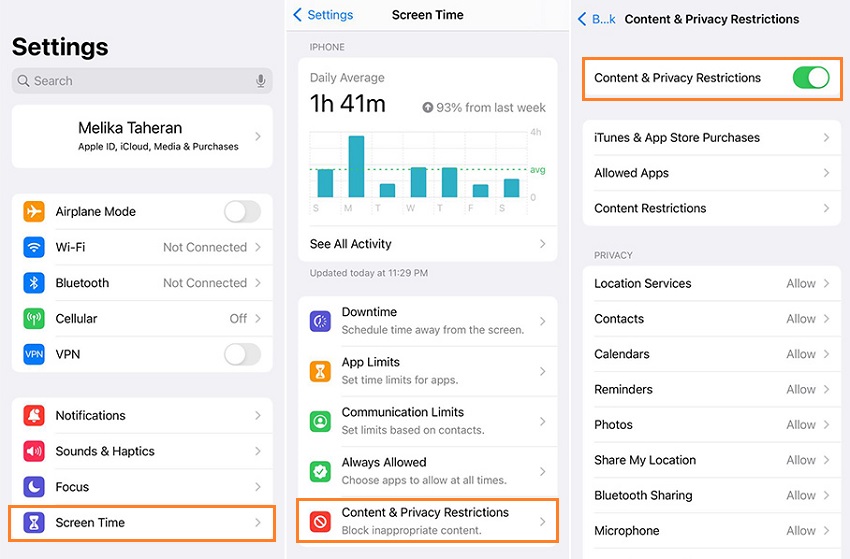 در روش دوم از Settings به Screen Time بروید و Content & Privacy Restrictions را انتخاب کنید. در مرحله بعد Content & Privacy Restrictions را فعال کنید.
