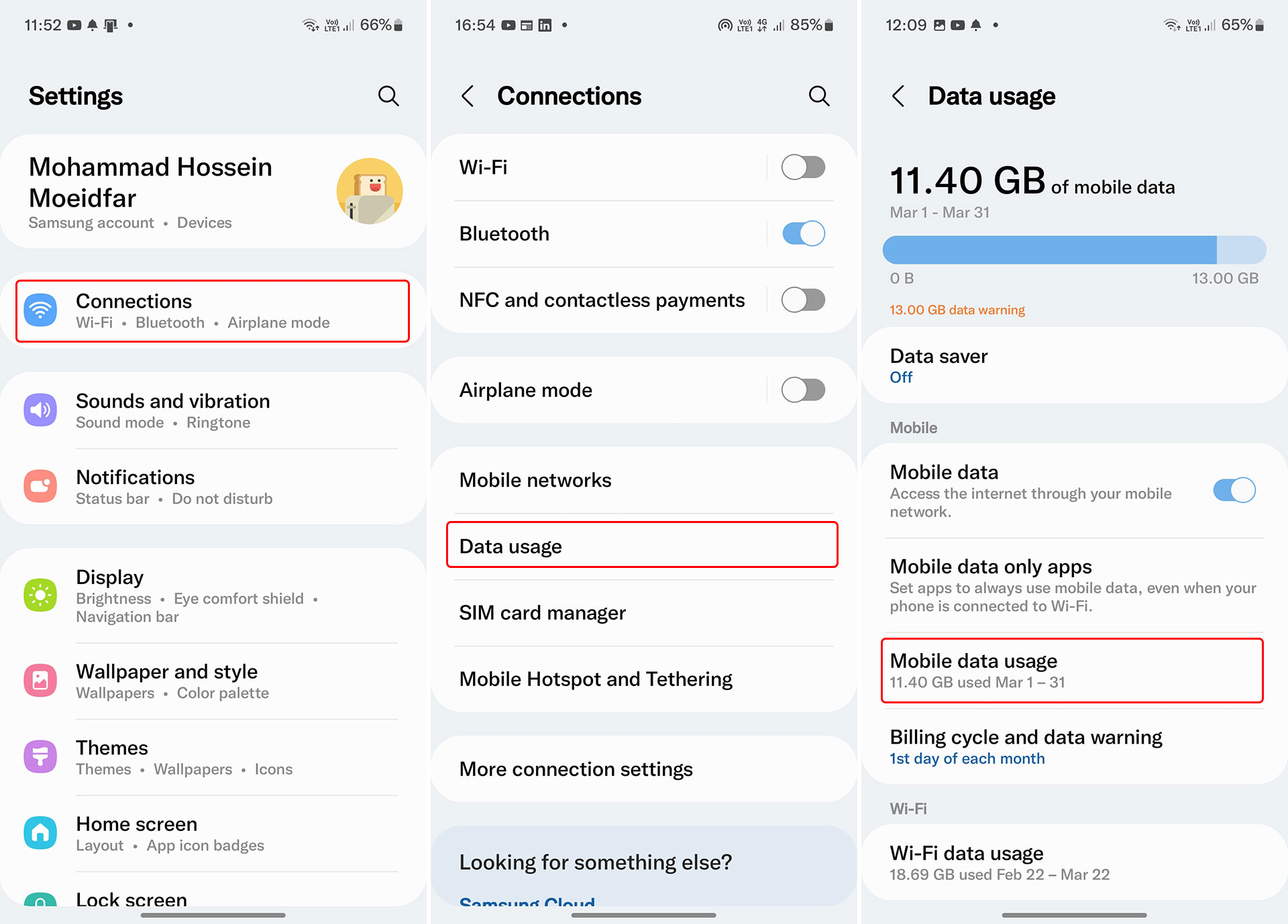 در گوشیهای سامسونگ این کار را به دو روش و فقط در مورد اینترنت همراه میتوان انجام داد. در روش اول میتوان هریک از اپلیکیشنهای دلخواه را از مصرف اینترنت در پسزمینه منع کرد. برای این کار به تنظیمات بروید، وارد بخش Connections (اتصالات) شده و در صفحه بعدی روی Data usage (استفاده از داده) ضربه بزنید. سپس وارد بخش Mobile data uasge (مصرف داده همراه) شوید.