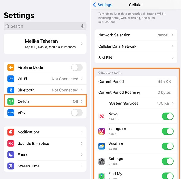 در گوشیهای آیفون بهمثابهی گوشیهای سامسونگ، این کار بهدو روش جزئی و کلی قابل انجام است. در روش اول ابتدا برنامه Setting را در آیفون خود باز کنید. روی Cellular ضربه بزنید. در صفحهی بعدی و در بخش CELLULAR DATA فهرستی از اپلیکیشنهای نصب شده بهنمایش درمیآید. برای خاموش کردن استفاده از دیتا برای هر برنامه کافی است که دکمه کنار نام برنامه را غیرفعال کنید.
