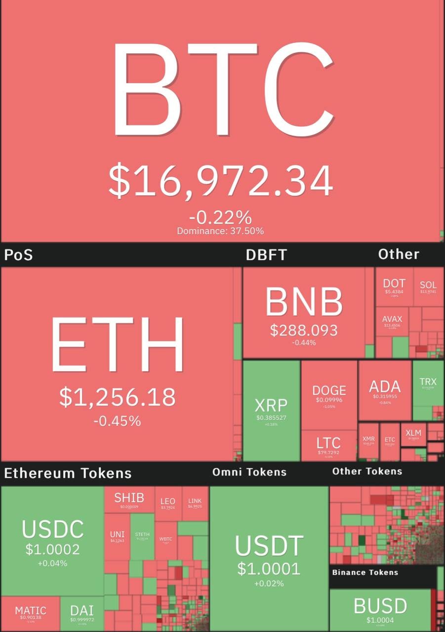 با توجه به پلتفرم ردیابی کوین مارکت کپ، قیمت بیتکوین در زمان نوشتن این مطلب، به ۱۶هزار و 972 دلار رسیده که در ۲۴ ساعت گذشته ۰.۸۲ درصد کاهش یافته است.