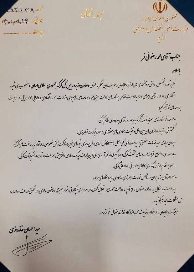 نظر به تعهد، تخصص، دانش وتوانمندیهای ارزنده جنابعالی به موجب این حکم به عنوان معاون وزیر و رئیس کل گمرک جمهوری اسلامی ایران منصوب می شوید. انتظار میرود در راستای اجرای اسناد بالادست نظام، برنامههای دولت سیزدهم و برنامههای راهبردی وزارت امور اقتصادی و دارایی موارد ذیل در اولویت برنامههای شما قرار گیرد: