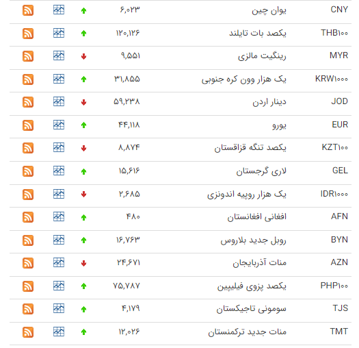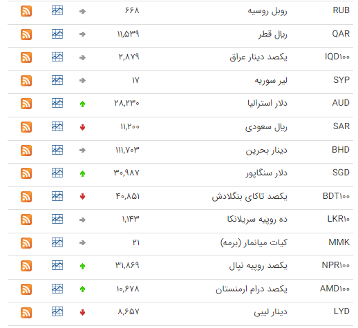 بر این اساس نرخ رسمی یورو، یوان چین، دلار استرالیا، دلار کانادا، ین ژاپن و افغانی افغانستان افزایش و نرخ رسمی پوند کاهش یافت. نرخ رسمی دینار عراق، لیر ترکیه و درهم امارات عربی متحده هم بدون تغییر باقی ماند.