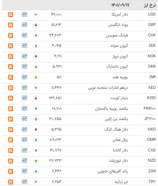 بانک مرکزی امروز پنجشنبه ( ۱۷ آذرماه)، نرخ رسمی دلار را ۴۲ هزار ریال، نرخ رسمی پوند انگلیس را ۵۱ هزار و ۲۱۳ ریال و نرخ رسمی یورو را ۴۴ هزار و ۱۱۸ ریال اعلام کرد.