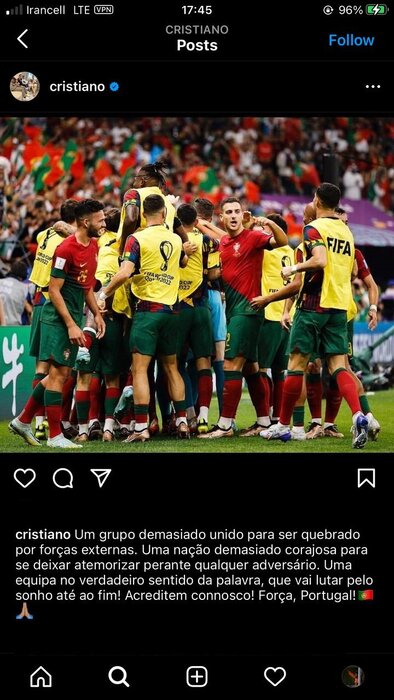 با این حال هنوز بازگشت کریستیانو رونالدو به ترکیب اصلی تیم ملی به یکی از مجهولات جام تبدیل شده است. این در حالی بود که بیش از ۹۳ درصد پرتغالیها خواهان نیمکت نشینی رونالدو هستند.