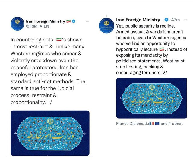 به گزارش سایت طلا،در صفحه توییتر وزارت امور خارجه جمهوری اسلامی ایران در این ارتباط آمده است :" ایران در مقابله با اغتشاشات، نهایت خویشتنداری را به خرج داده و بر خلاف بسیاری از رژیمهای غربی که حتی معترضان مسالمتجو را نیز بدنام و با خشونت سرکوب میکنند، از روشهای متناسب و استاندارد ضداغتشاش بهره گرفته است. همین امر برای روند قضایی نیز صادق است.