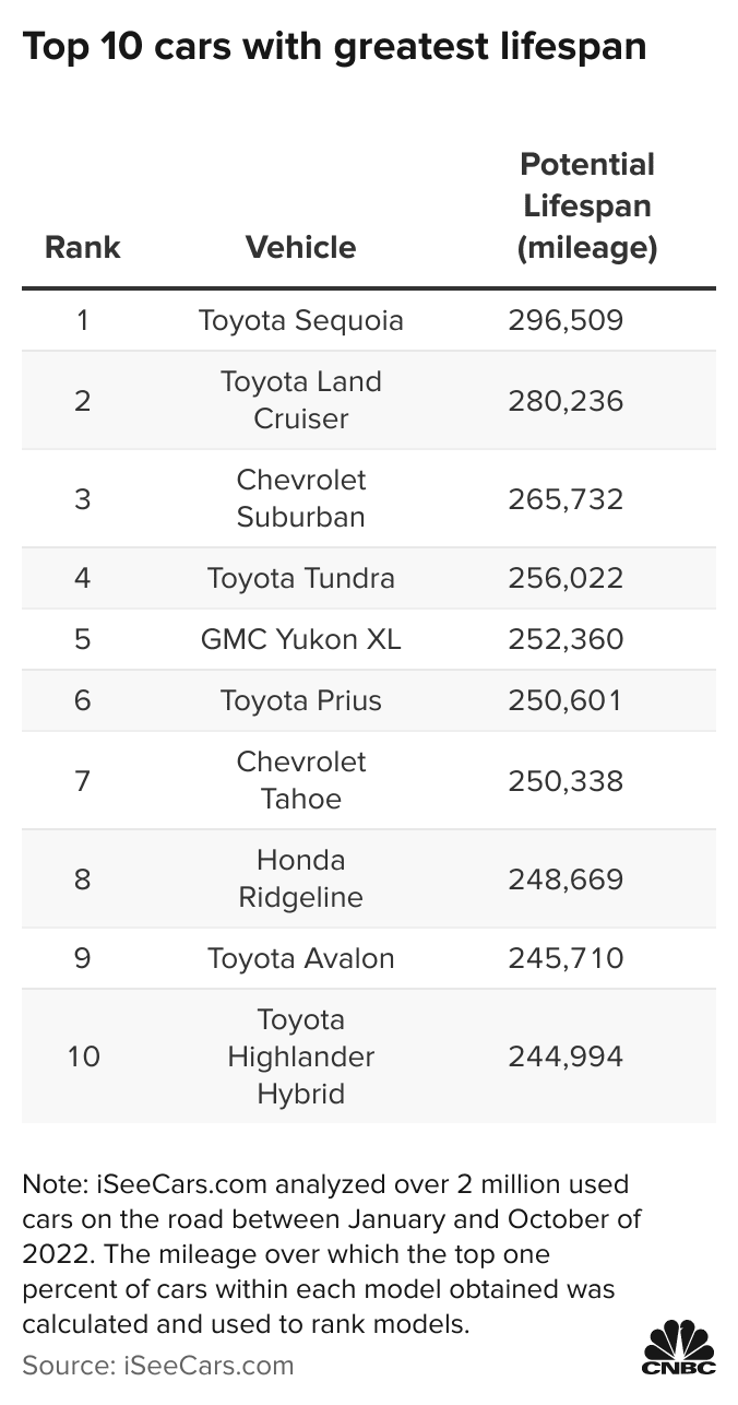بر اساس مطالعه اخیر iSeeCars که بیش از 2 میلیون خودرو در 20 سال گذشته را مورد تجزیه و تحلیل قرار داده است، در میان مدل هایی با بیشترین طول عمر، تویوتا سکویا با توانایی پیمایش نزدیک به 300هزار مایل در صدر فهرست قرار گرفت و پس از آن لندکروزر قرار گرفت. ببینید کدام خودروها می توانند طولانی ترین عمر را داشته باشند.