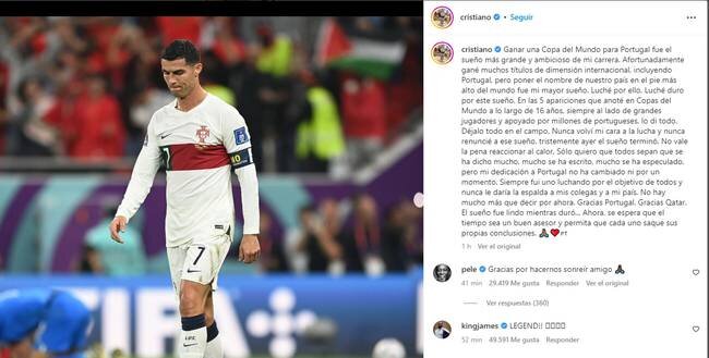 رونالدو در این پست اینستاگرامی نوشت:" قهرمانی در جام جهانی با پرتغال، بزرگترین و بلندپروازانه ترین رویای دوران حرفه ای من بود. خوشبختانه عناوین زیادی در ابعاد بین المللی از جمله با لباس تیم ملی پرتغال کسب کردهام، اما قرار دادن نام کشورمان در قله فوتبال جهان، بزرگترین آرزوی من بود. من برای رسیدن به این هدف و برآورده شدن این رویا سخت مبارزه کردم. در ۵ حضور طی ۱۶ سال در جام جهانی گلزنی کرده و همیشه در کنار بازیکنان و با حمایت میلیونها نفر، تمام تلاشم را کردم".