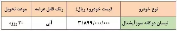 در این طرح نیسان دوگانه سوز آپشنال با قیمت ۳۸۹ میلیون و ۹۰۰ هزار تومان در رنگ آبی به بازار عرضه میشود. همچنین سایپا این خودرو را با موعد تحویل ۳۰ روزه به دست مشتریان خواهد رساند.