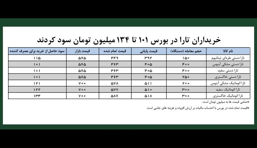 براساس آمارهای معاملاتی امروز درمجموع ۱۲۰۰ دستگاه تارا دستی و ۸۰۰ دستگاه تارا اتوماتیک در بورس به فروش رسید که با احتساب هزینههای تمام شده، خودروهای فروش رفته بین ۱۰۱ تا ۱۳۴ میلیون تومان به نفع مصرف کننده تمام شد. به بیان سادهتر در تارا دستی نقرهای سود مصرف کننده ۱۱۵ میلیون تومان و در تارا دستی مشکی، سفید و خاکستری هر یک سود مصرف کننده ۱۰۱ میلیون تومان بود.