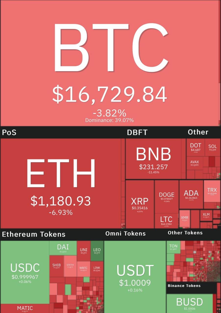 بیت‌کوین با افت حدود ۴ درصد به قیمت ۱۶ هزار و ۷۲۹ دلار و اتریوم با ریزش حدود ۷ درصد به قیمت هزار و ۱۸۰ دلار معامله می‌شوند.