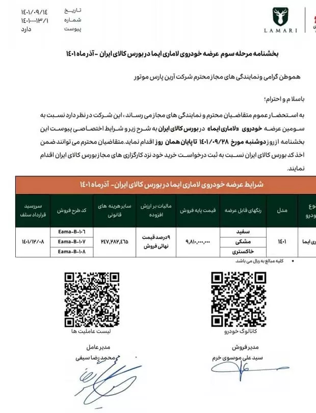 به گزارش سایت طلا، شرکت آرین پارس موتور در بخشنامه جدید خود، شرایط فروش لاماری ایما در بورس کالا را در آذر ماه ۱۴۰۱ منتشر کرده است. جزئیات را در ادامه بخوانید.