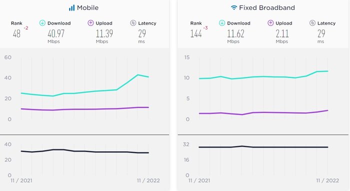 میانگین سرعت دانلود اینترنت سیار بر اساس این شاخص، ۵۴.۹۳ مگابیت بر ثانیه، سرعت آپلود ۱۴.۴۶ مگابیت بر ثانیه و میزان تأخیر ۳۳ میلیثانیه است. در اینترنت ثابت، سرعت دانلود ۲۴.۶۱ مگابیت بر ثانیه، سرعت آپلود ۱۴.۲۳ مگابیت بر ثانیه و میزان تأخیر ۴۰ میلیثانیه است.
