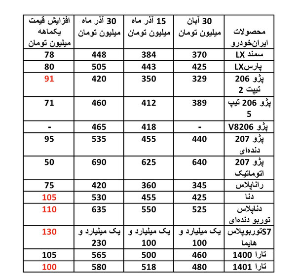 در محصولات ایرانخودرو، کمترین میزان افزایش قیمت ۵۰ میلیون تومان و بیشترین افزایش قیمت ۱۳۰ میلیون تومان بوده که مربوط به هایما S۷ توربوپلاس است. دناپلاس توربو ۱۱۰ میلیون تومان، دنا ۱۰۵ میلیون تومان و تارا نیز ۱۰۰ میلیون تومان افزایش بها داشتهاند.