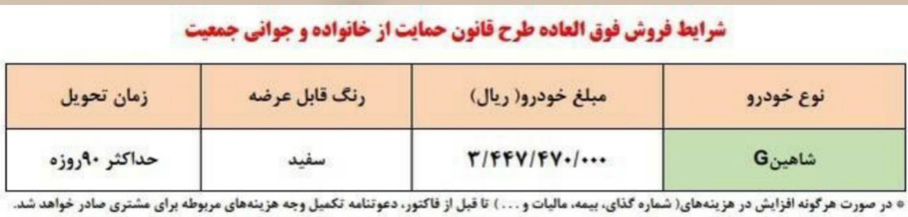 گروه خودروسازی سایپا شرایط فروش فوق العاده خودروی شاهین را ویژه طرح قانون حمایت از خانواده و جوانی جمعیت اعلام کرد.