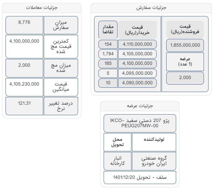 به گزارش سایت طلا، امروز 4 دی 1401 2000 هزار دستگاه پژو 207 دستی در بورس کالا عرضه شد.