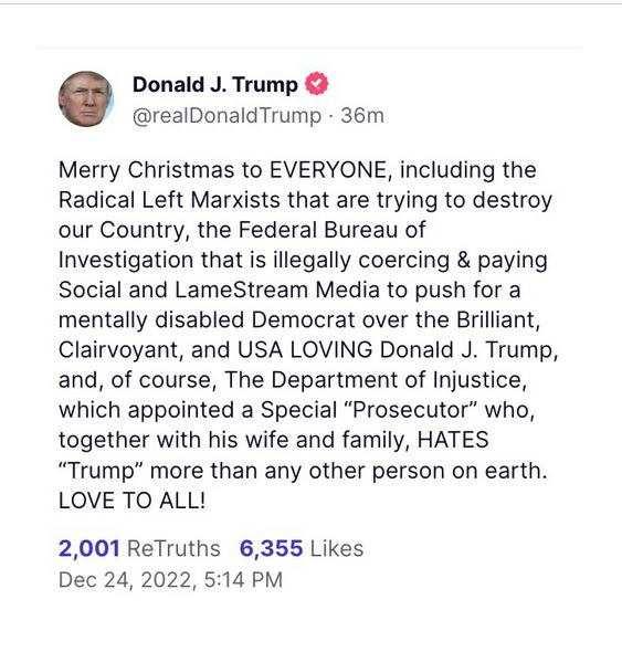 وی در این پیام نوشت: «کریسمس همه از جمله مارکیستهای چپ افراطی که تلاش میکنند کشور ما را نابود کنند و همچنین دفتر تحقیقات فدرال که به صورت غیرقانونی شبکههای اجتماعی و رسانههای علیل و ذلیل (Lamestream Media) را وادار میکند و به آنها پول میدهد تا یک دموکرات ناتوان ذهنی (جو بایدن) را به دونالد جی ترامپ با استعداد و روشنبین و آمریکادوست ترجیح دهند و برای او تلاش کنند و قطعاً وزارت ناعدلی (وزارت دادگستری آمریکا) که یک "دادستان" ویژهای را به استخدام درآورده که به همراه همسر و خانوادهاش از "ترامپ" بیش از هرکس دیگری در زمین نفرت دارد، مبارک. عاشقتونم!»