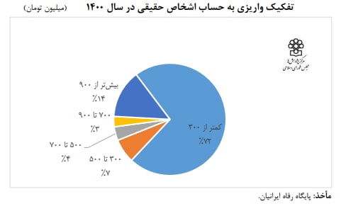 بر اساس گزارش مرکز پژوهش‌های مجلس طبق آمار پایگاه رفاه ایرانیان، در سال ۱۴۰۰ مجموع واریزی به حساب ۷۹ درصد از اشخاص حقیقی کمتر از ۵۰۰ میلیون تومان بوده است.