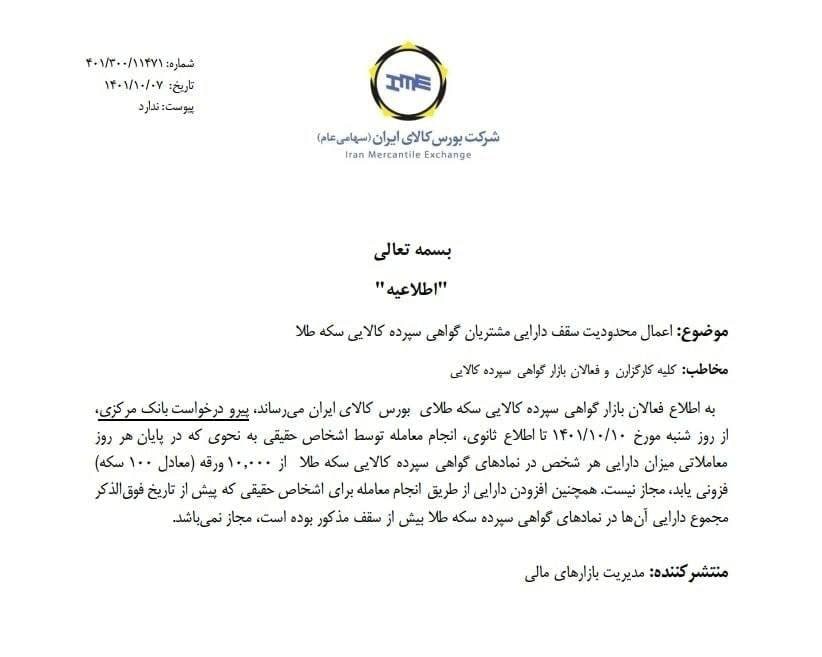 در این اطلاعیه آمده است: پیرو درخواست بانک مرکزی، از روز شنبه مورخ 1401/10/10 تا اطلاع ثانوی، انجام معامله توسط اشخاص حقیقی به نحوی که در پایان هر روز معاملاتی میزان دارایی هر شخص در نمادهای گواهی سپرده کالایی سکه طلا از 10.000 ورقه (معادل 100 سکه) فزونی یابد، مجاز نیست.